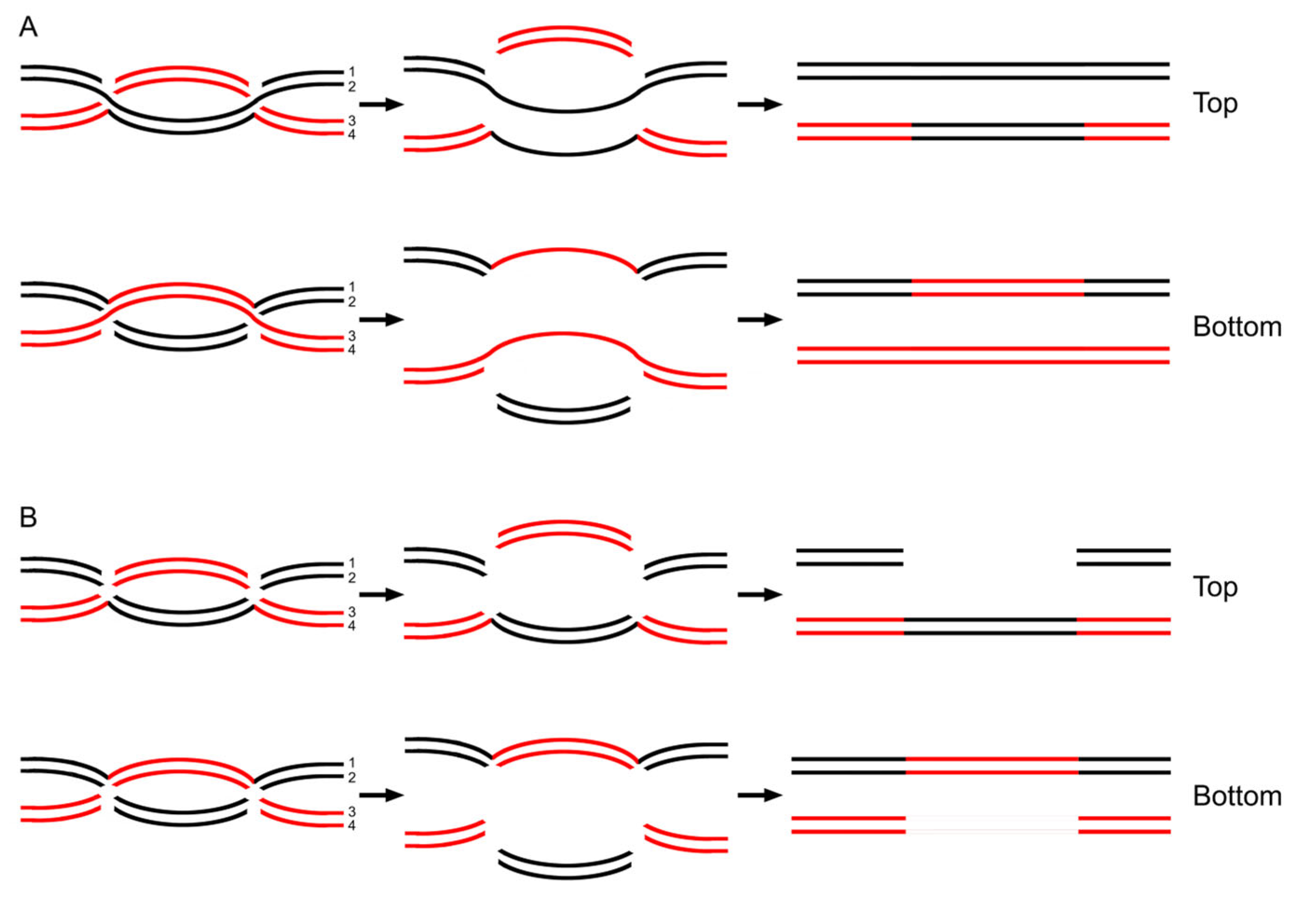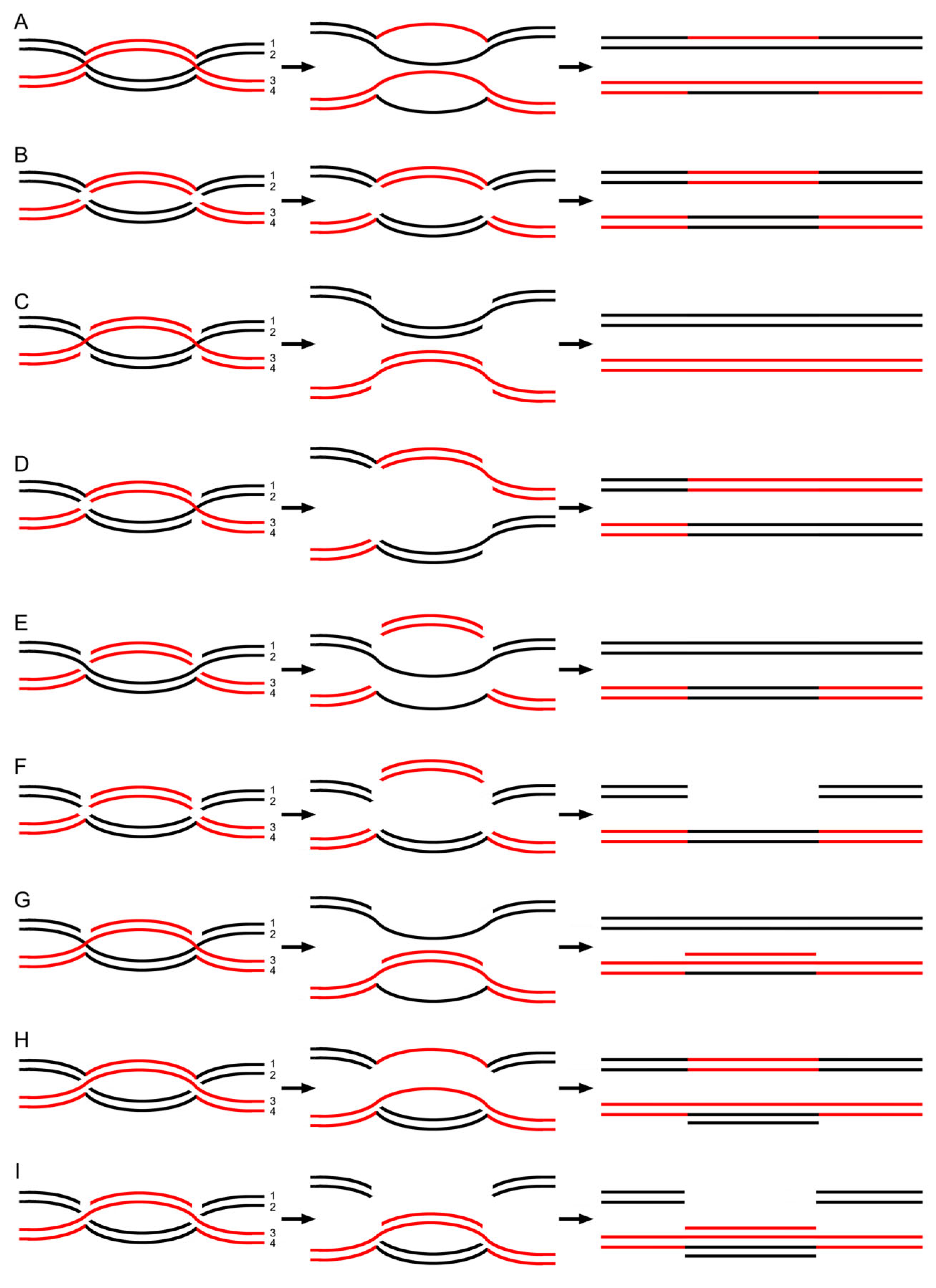 [14,15,16] | The bi-directional configuration of heteroduplex segments, which was predicted by the DSBR model, was rarely observed. | |