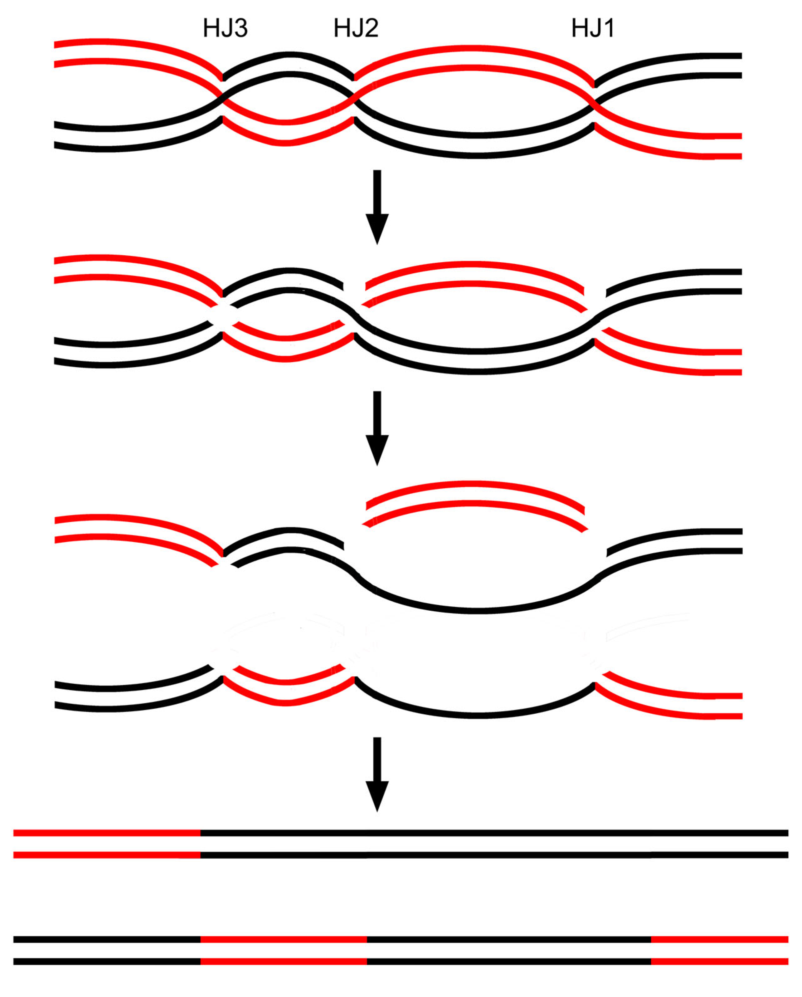 [1] | hDNA forms early during strand invasion and is followed by a JM. Finally, crossover products are generated via JM resolution. | hDNA > JM > products |