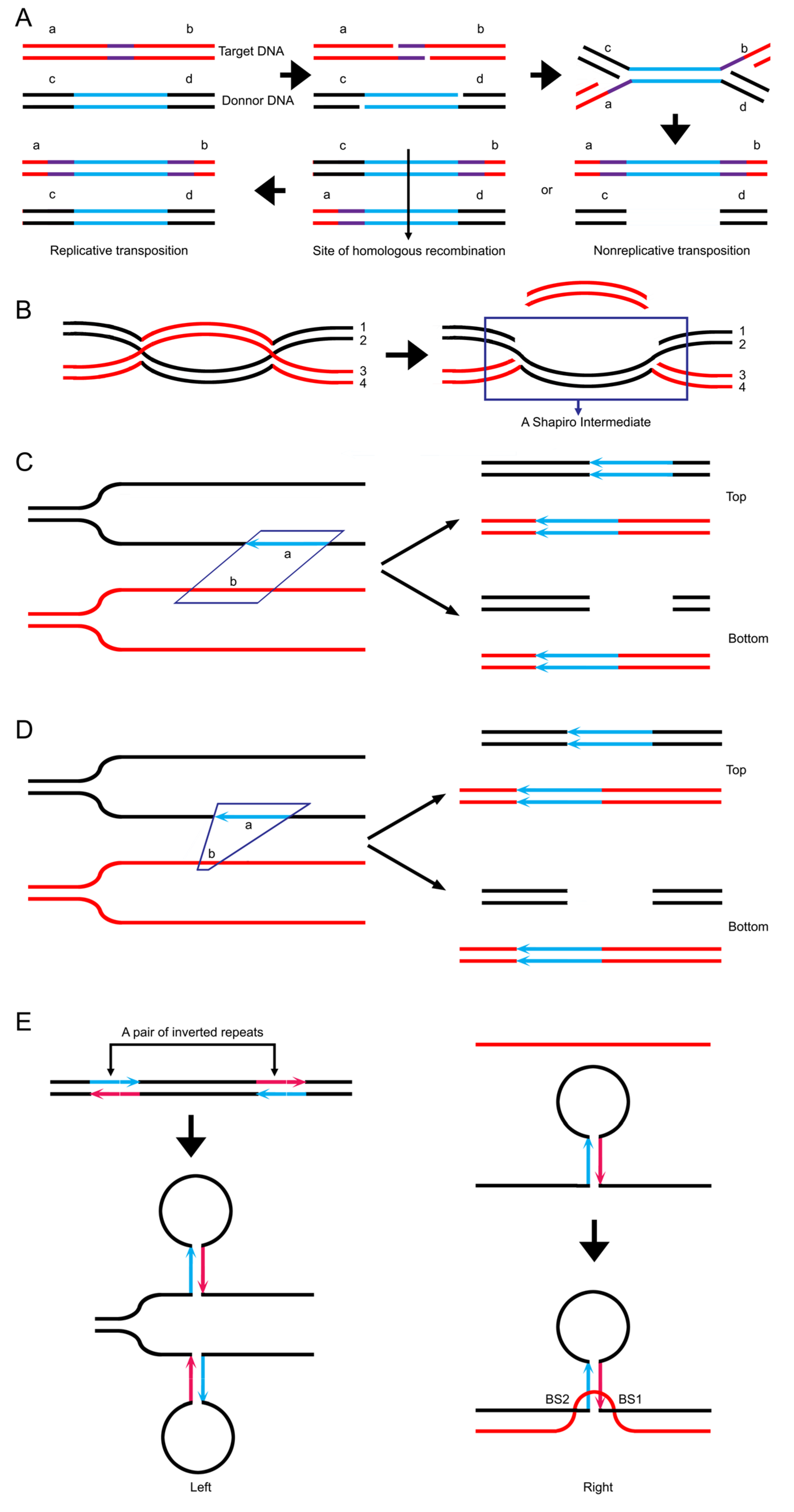 - Shapiro, J.A. Molecular model for the transposition and replication of bacteriophage Mu and other transposable elements. Proc. Natl. Acad. Sci. USA 1979, 76, 1933–1937. [Google Scholar] [CrossRef]