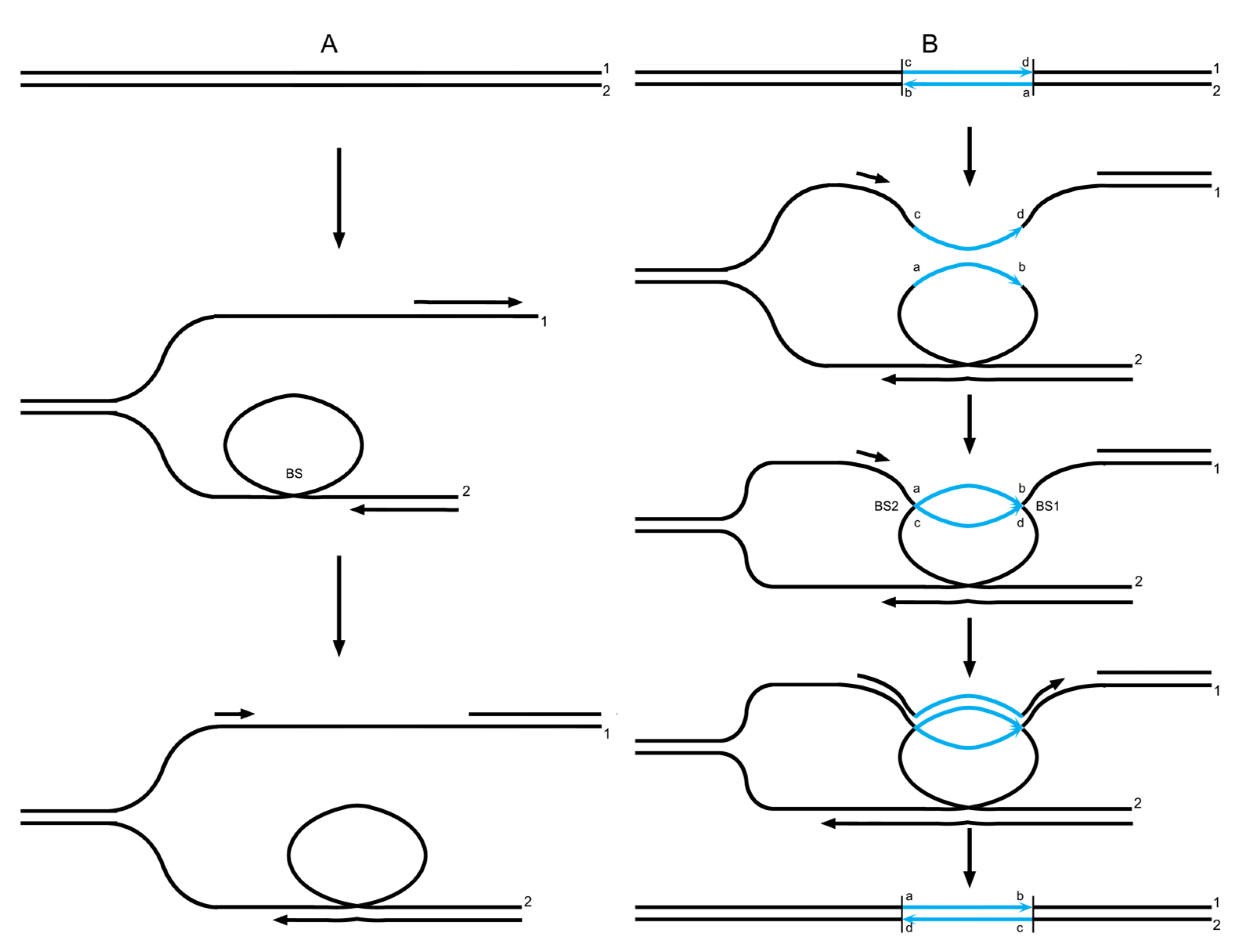[29] | Nearly precise excision was significantly stimulated by rolling circle replication, and this process did not involve the transfer of DNA from the parental molecule to the recombinant molecule. | The same as above. |