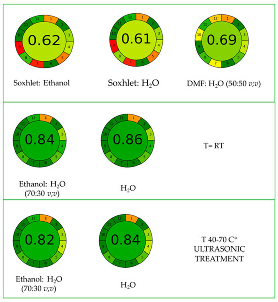 The extraction of polyphenols present in Citrus bergamia “pastazzo” were initially performed using the simulation program AGREE (Analitical GREenEss calculator, (Michigan Engineering, 1221 Beal Ave. Ann Arbor, MI 48109-2102) [31]. It allowed the selection of solvent and extraction methods with the release of the best index. Subsequently, extraction and identification were carried out. The starting point was to analyze and to compare the classical reference systems for extraction (Soxhlet extraction) with the methods present in the literature, which give the highest yields (50% dimethylformamide in water), and to program greener systems. In Figure 1 is depicted the green index obtained with the simulation program. The results of the simulation clearly indicated the possibility to utilize green solvents and ultrasound to achieve more eco-friendly processes than traditional ones.
