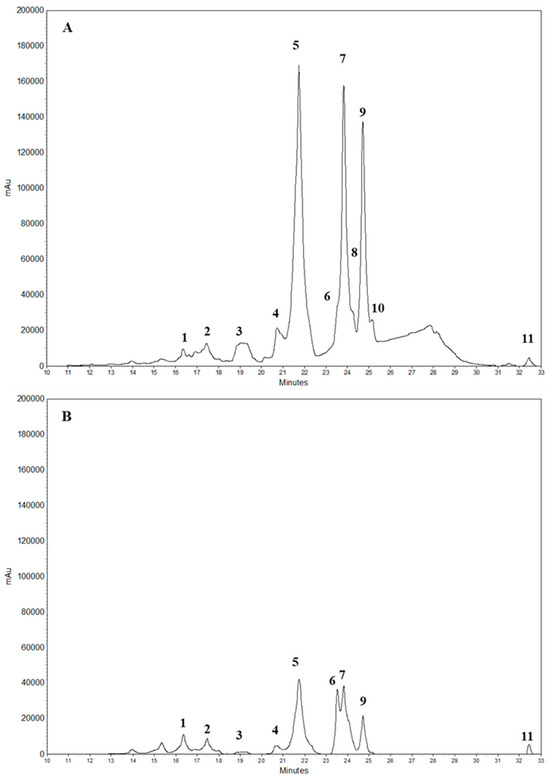 Representative RP-HPLC-DAD chromatogram separation of the flavonoids obtained from Citrus bergamia pastazzo recorded at 278 and 325 nm, obtained by ethanolic extraction (70:30, v:v) of Citrus bergamia by-product after industrial extraction of the juice and essential oils. Components 1–11 were identified as follows: vicenin-2 (1); lucenin-2 4′-methyl ether (2); eriocitrin (3); isovitexin (4); neoeriocitrin (5); rhoifolin (6); naringin (7); chrysoeriol 7-O-neohesperidoside (8); neohesperidin (9); neodiosmin (10); bergapten (11).