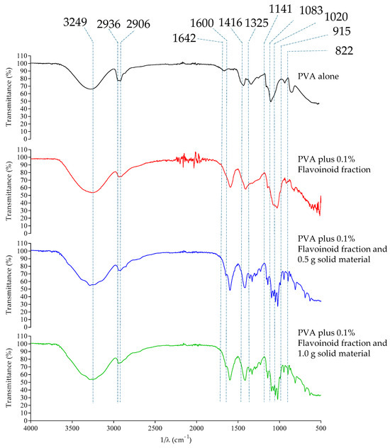 ) PVA plus 0.1% flavonoid fraction, liquid fraction obtained after digestion with cellulase and pectinase and 1.0 g of the solid material remaining after enzyme treatment. Band assignment: 3249 cm−1 (O–H stretching); 2936 cm−1 (asymmetric stretching of CH2); 2906 cm−1 (symmetric stretching of CH2); 1643 cm−1 (water absorption); 1416 cm−1 (CH2 bending); 1325 cm−1 (δ (OH); rocking with CH wagging); 1141 cm−1 (shoulder stretching of C–O) (crystalline sequence of PVA); 1083 cm−1 (stretching of C=O and bending of OH) (amorphous sequence of PVA); 1020 cm−1 (C–O symmetric stretching of the primary alcohol); 915 cm−1 (CH2 rocking); 822 cm−1 (C–C stretching).
