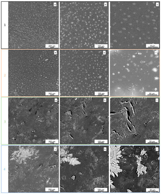 SEM images of new PVA-based bioplastics produced by the addition of increasing Citrus bergamia by-product obtained during our experimentation. 1—(a–c) PVA alone; 2—(d–f) PVA plus 0.1% flavonoid fraction and liquid fraction obtained after digestion with cellulase and pectinase; 3—(g–i) PVA plus 0.1% flavonoid fraction, liquid fraction obtained after digestion with cellulase and pectinase and 0.5 g of the solid material remaining after enzyme treatment; 4—(j–l) PVA plus 0.1% flavonoid fraction, liquid fraction obtained after digestion with cellulase and pectinase and 1.0 g of the solid material remaining after enzyme treatment, at 200, 100 and 50 µm, respectively.