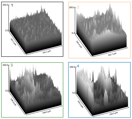 3D surface plots of PVA-based films obtained from SEM micrographs after ImageJ processing: (1) PVA alone (sample 1); (2) PVA plus 0.1% flavonoid fraction and liquid fraction obtained after digestion with cellulase and pectinase (sample 2); (3) PVA plus 0.1% flavonoid fraction, liquid fraction obtained after digestion with cellulase and pectinase and 0.5 g of the solid material remaining after enzyme treatment (sample 3); (4) PVA plus 0.1% flavonoid fraction, liquid fraction obtained after digestion with cellulase and pectinase and 1.0 g of the solid material remaining after enzyme treatment (sample 4). A progressive decrease in surface porosity (2.93%, 0.014%, 0.008% and 0.005%, respectively) is observed, together with an increase in surface roughness and heterogeneity, particularly in sample 4, where the incorporation of solid residue leads to pronounced topographical irregularities.