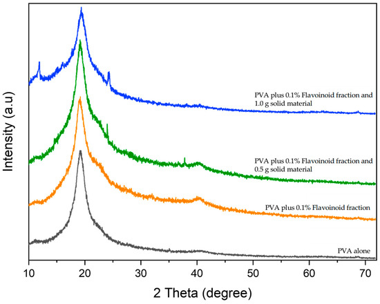 The XRD spectra of the prepared bioplastics. PVA alone (black line); PVA plus 0.1% flavonoid fraction and liquid fraction obtained after digestion with cellulase and pectinase (orange line); PVA plus 0.1% flavonoid fraction, liquid fraction obtained after digestion with cellulase and pectinase and 0.5 g of the solid material remaining after enzyme treatment (green line); (4) PVA plus 0.1% flavonoid fraction, liquid fraction obtained after digestion with cellulase and pectinase and 1.0 g of the solid material remaining after enzyme treatment (blue line).