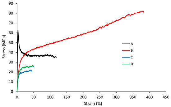 Representative stress–strain curves of new PVA-based bioplastics produced by the addition of increasing Citrus bergamia. PVA alone (black line); PVA plus 0.1% flavonoid fraction and liquid fraction obtained after digestion with cellulase and pectinase (red line); PVA plus 0.1% flavonoid fraction, liquid fraction obtained after digestion with cellulase and pectinase and 0.5 g of the solid material remaining after enzyme treatment (blue line); PVA 0.1% flavonoid fraction, liquid fraction obtained after digestion with cellulase and pectinase and 1.0 g of the solid material remaining after enzyme treatment (green line).