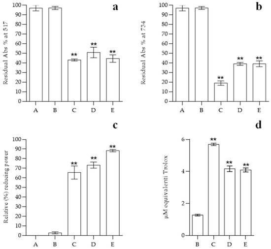 Evaluation of antioxidant activity of PVA-based bioplastics produced by the addition of increasing Citrus bergamia by-product obtained during our experimentation. (a) DPPH assay; (b) ABTS assay; (c) ferric reducing power (FRAP) assay; (d) CUPRAC. The letters in the different graph indicate the following: A, control sample; B, PVA alone; C, PVA plus 0.1% flavonoid fraction and liquid fraction obtained after digestion with cellulase and pectinase; D, PVA plus 0.1% flavonoid fraction, liquid fraction obtained after digestion with cellulase and pectinase and 0.5 g of the solid material remaining after enzyme treatment; E, PVA plus 0.1% flavonoid fraction, liquid fraction obtained after digestion with cellulase and pectinase and 1.0 g of the solid material remaining after enzyme treatment. ** p < 0.001.