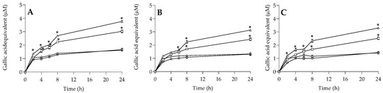 Release for short- and long-term migration of polyphenols from PVA films in different food simulants. (A) PVA plus 0.1% flavonoid fraction and liquid fraction obtained after digestion with cellulase and pectinase; (B) PVA plus 0.1% flavonoid fraction, liquid fraction obtained after digestion with cellulase and pectinase and 0.5 g of the solid material remaining after enzyme treatment; (C) PVA plus 0.1% flavonoid fraction, liquid fraction obtained after digestion with cellulase and pectinase and 1.0 g of the solid material remaining after enzyme treatment. (○) H2O; (□) ethanol 10%; (△) ethanol 50%; (◊) acetic acid 3%. Asterisk (*) indicates significant difference with respect to the samples in H2O at a p < 0.05.