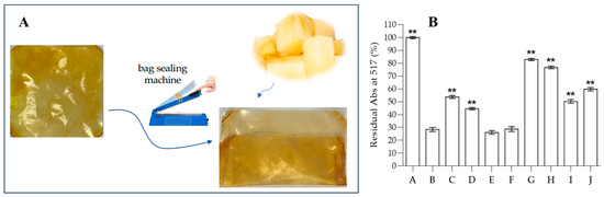 Schematic representation of the bioplastic bag preparation by heat-sealing method (A) and analysis of the changes in the antioxidant activity (B) of apple samples packed or not packed after different intervals of time (0, 24 and 48 h). As far as the preparation of the bags are concerned, the bioplastic has been cut into square pieces (6.0 cm × 6.0 cm) and two sides have been sealed with a bag-sealing machine. Once the cubes of apple have been inserted, the last side has been sealed with a bag-sealing machine. The letters in the graph indicate the following: A, B and G) apple samples not packed; C and H) apple sample packed with PHA film; D and I) apple samples packed with PVA plus 0.1% flavonoid fraction and liquid fraction obtained after digestion with cellulase and pectinase; E and L) PVA plus 0.1% flavonoid fraction, liquid fraction obtained after digestion with cellulase and pectinase and 0.5 g of the solid material remaining after enzyme treatment; F and M) PVA plus 0.1% flavonoid fraction, liquid fraction obtained after digestion with cellulase and pectinase and 1.0 g of the solid material remaining after enzyme treatment. The ** indicates significant changes with respect to apple samples not packed at 0 h at p > 0.05.