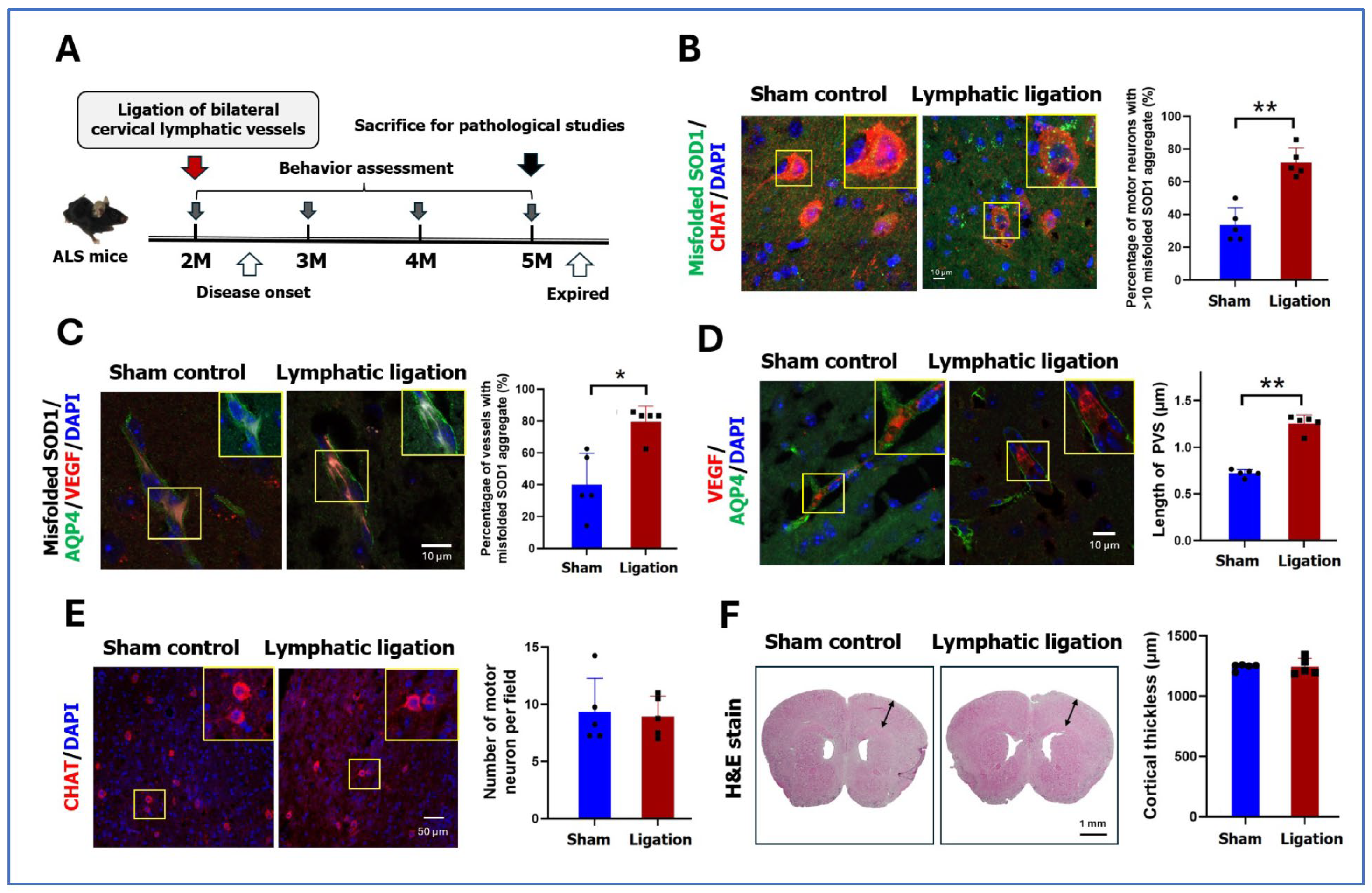 2.4. Pathology and Behaviors After Ligation of Cervical Lymphatic Vessels in ALS Mice