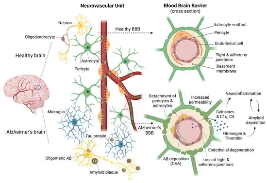 Alterations of BBB integrity in AD. In a healthy brain (top), the NVU maintains the integrity of the BBB. This promotes a healthy brain microenvironment characterized by physiological function, cell-to-cell communication, adequate blood flow and nutrient supply, and low levels of inflammation. By contrast, pathological features characterize the AD’s brain (bottom), such as the accumulation of NFTs of hyperphosphorylated tau protein and the accumulation of intracellular Aβ oligomers, and the deposition of extracellular Aβ plaques. These events are accompanied by activated microglia, resulting in the release of pro-inflammatory mediators. On the right, a detailed cross-sectional view of the BBB illustrates the NVU’s structural organization, emphasizing the presence of tight and adherens junctions between vascular endothelial cells. These junctions are critical for maintaining barrier integrity and selective permeability. In AD, the pathological condition is characterized by altered intercellular communication between endothelial cells in blood vessels, pericytes, and astrocytes. This results in the degeneration of the NVU and significantly disrupts the BBB. Increased BBB permeability allows plasma components such as fibrinogen, thrombin, complement proteins (C1q and C3), and cytokines to infiltrate brain tissue. These molecules promote further Aβ deposition and exacerbate neuroinflammation, thus perpetuating BBB damage and neurodegeneration. [Created with BioRender.com].
