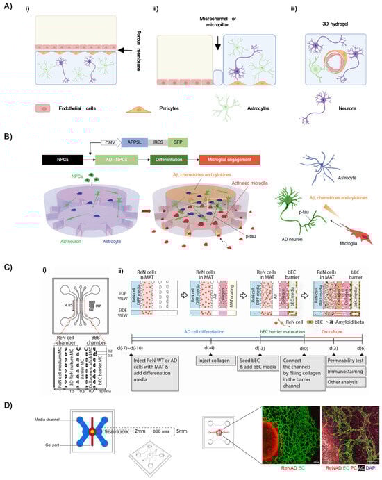 (A) Schematic representation of three microfluidic device configurations: (i) vertical, (ii) parallel, and (iii) full-contact. (B) Schematics showing multicellular 3D layouts in a microfluidic human AD culture model (reprinted with permission from []). (C) (i) Schematic of a microfluidic parallel configuration highlighting the ReN-AD and BBB chambers, separated by an intervening barrier microchannel (MC), and (ii) experimental protocol for AD model development (reprinted with permission from []). (D) (Left): Schematic of a microfluidic platform used to create a BBB in a circular compartment (red) surrounding a central neural compartment (yellow), allowing direct communication. Side media channels (blue) are used to perfuse the BBB by creating a pressure gradient across the central compartments. (Right): Confocal projected z-stack of a portion of the full device with immunofluorescence staining after 30 days of co-culture (reprinted with permission from []).