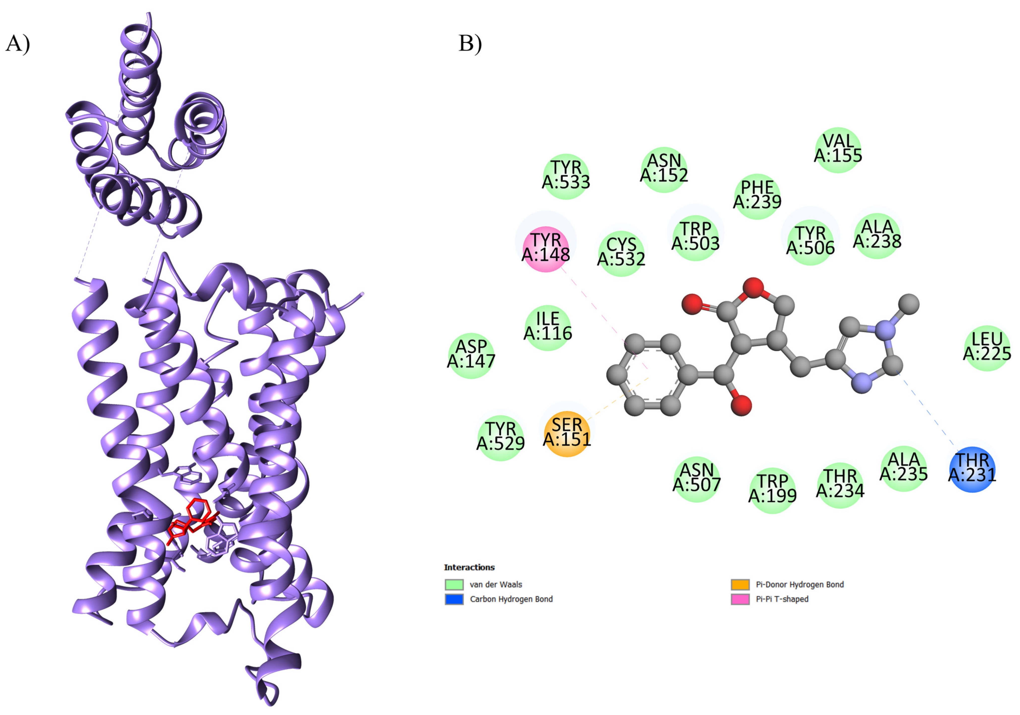 EPI-4U14 | −8.6 | 100 | 0.438 | Ser A: 151, Tyr A: 529, Asp A: 147, Ile A: 116, Tyr A: 148, Tyr A: 533, Cys A: 532, Asn A: 152, Trp A: 503, Phe A: 239, Tyr A: 506, Val A: 155, Ala A: 238, Leu A: 225, Thr A: 231, Ala A: 235, Thr A: 234, Trp A: 199, Asn A: 507 | Human GPCR involved in smooth muscle contraction, glandular secretions, vomiting induction, and cardiovascular regulation, as its activation in endothelial cells stimulates nitric oxide production, promoting vasodilation and blood pressure control. |