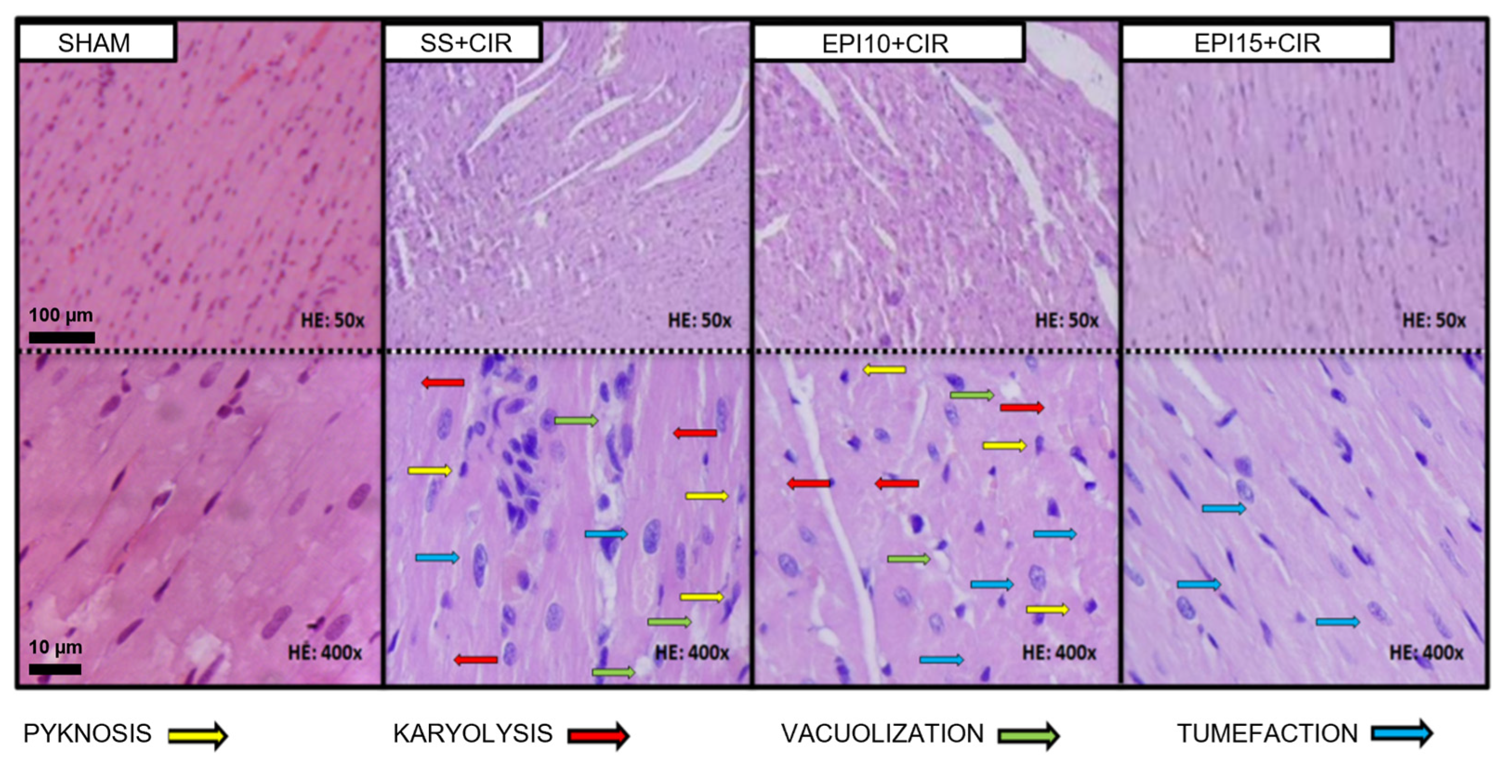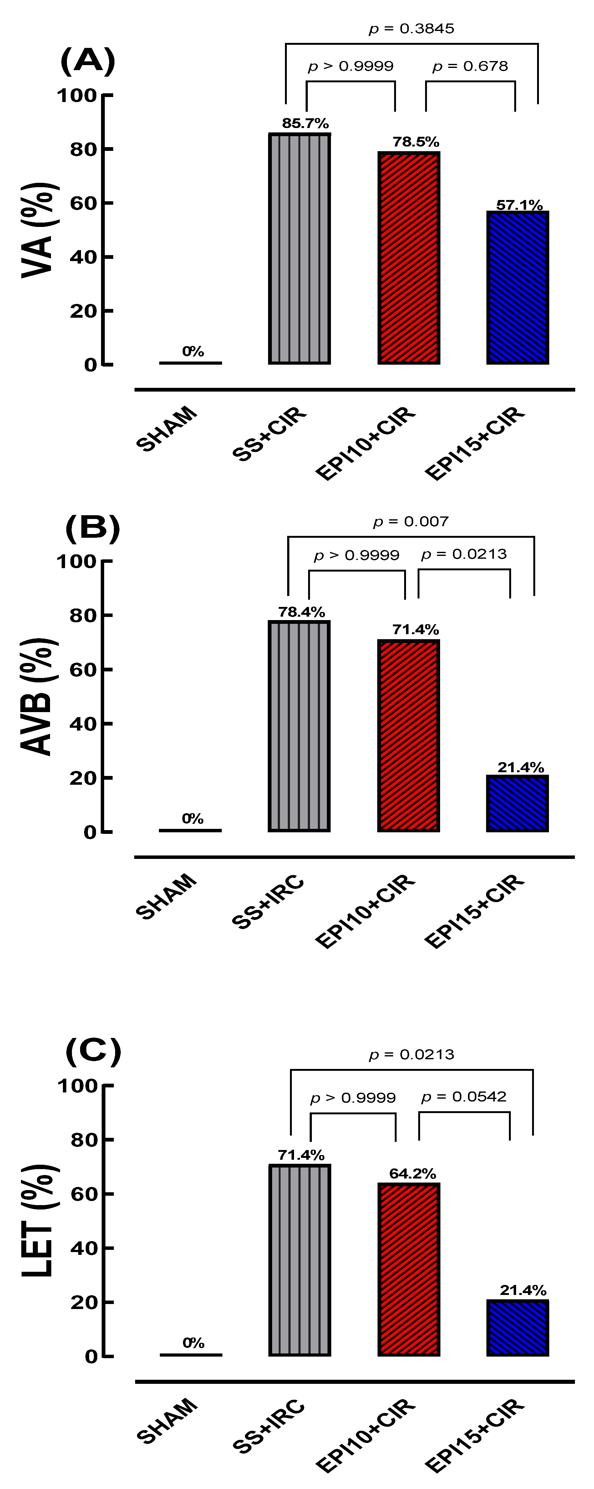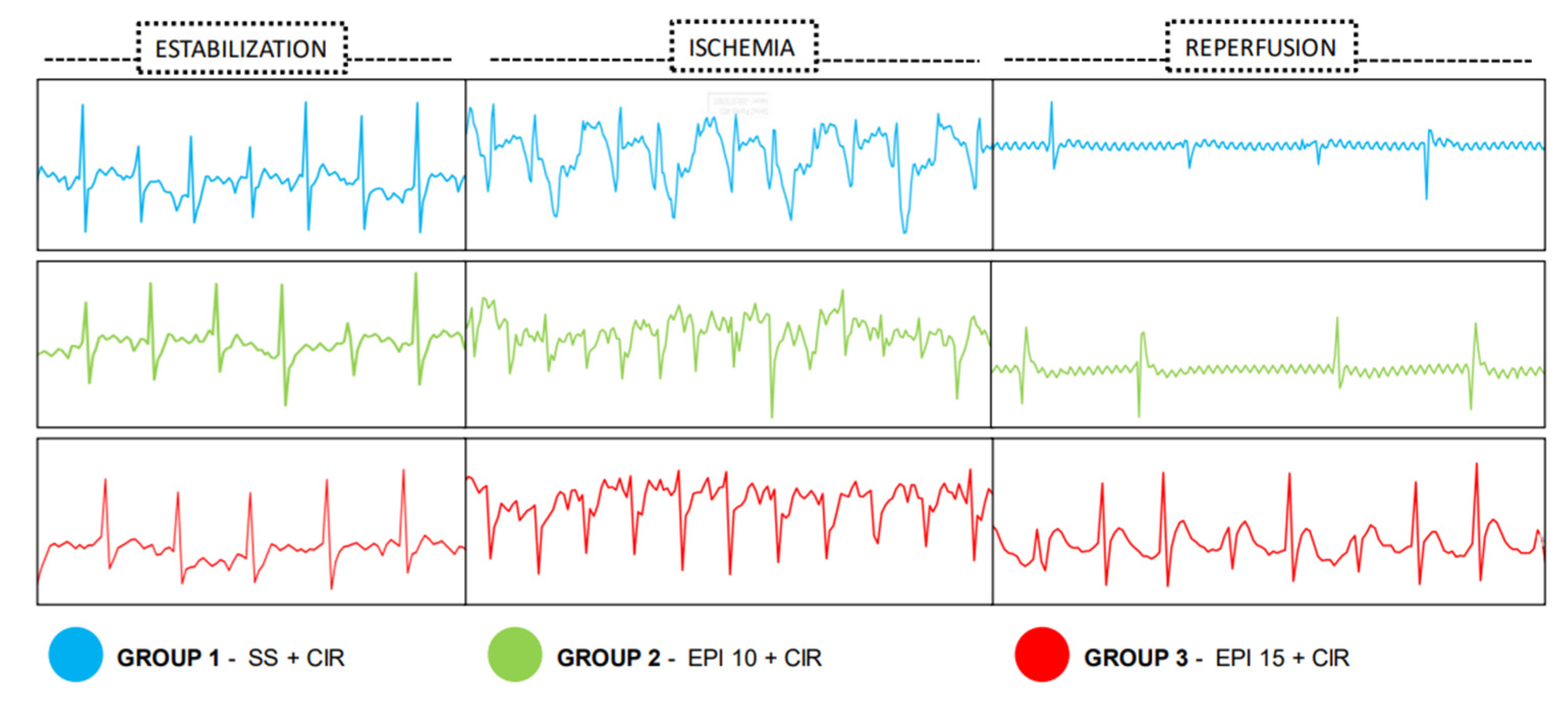 - EPI15 + CIR group (n = 14): NWRs were pretreated with 15 mg/kg EPI intravenously prior to cardiac ischemia and reperfusion (CIR). They were also subjected to ECG analysis to ascertain the incidence of VA, AVB, and LET.