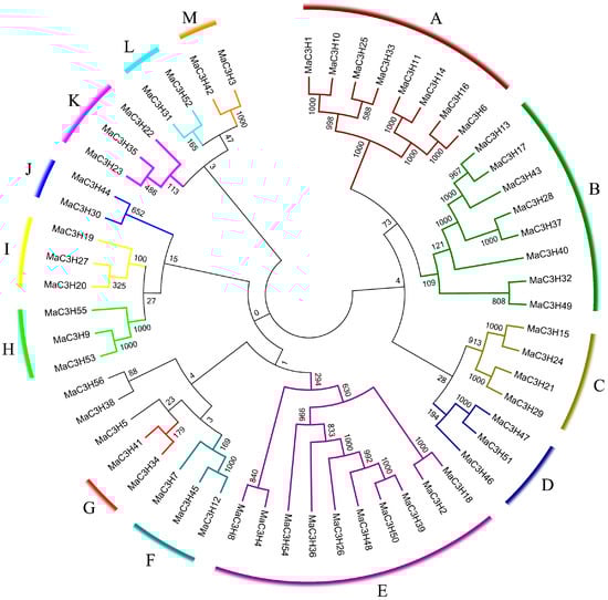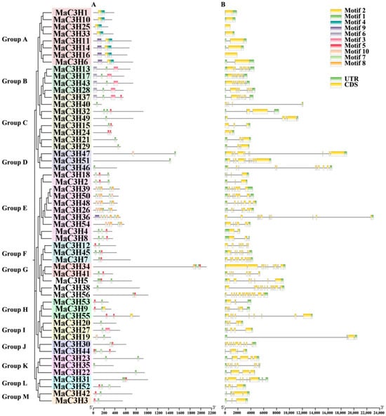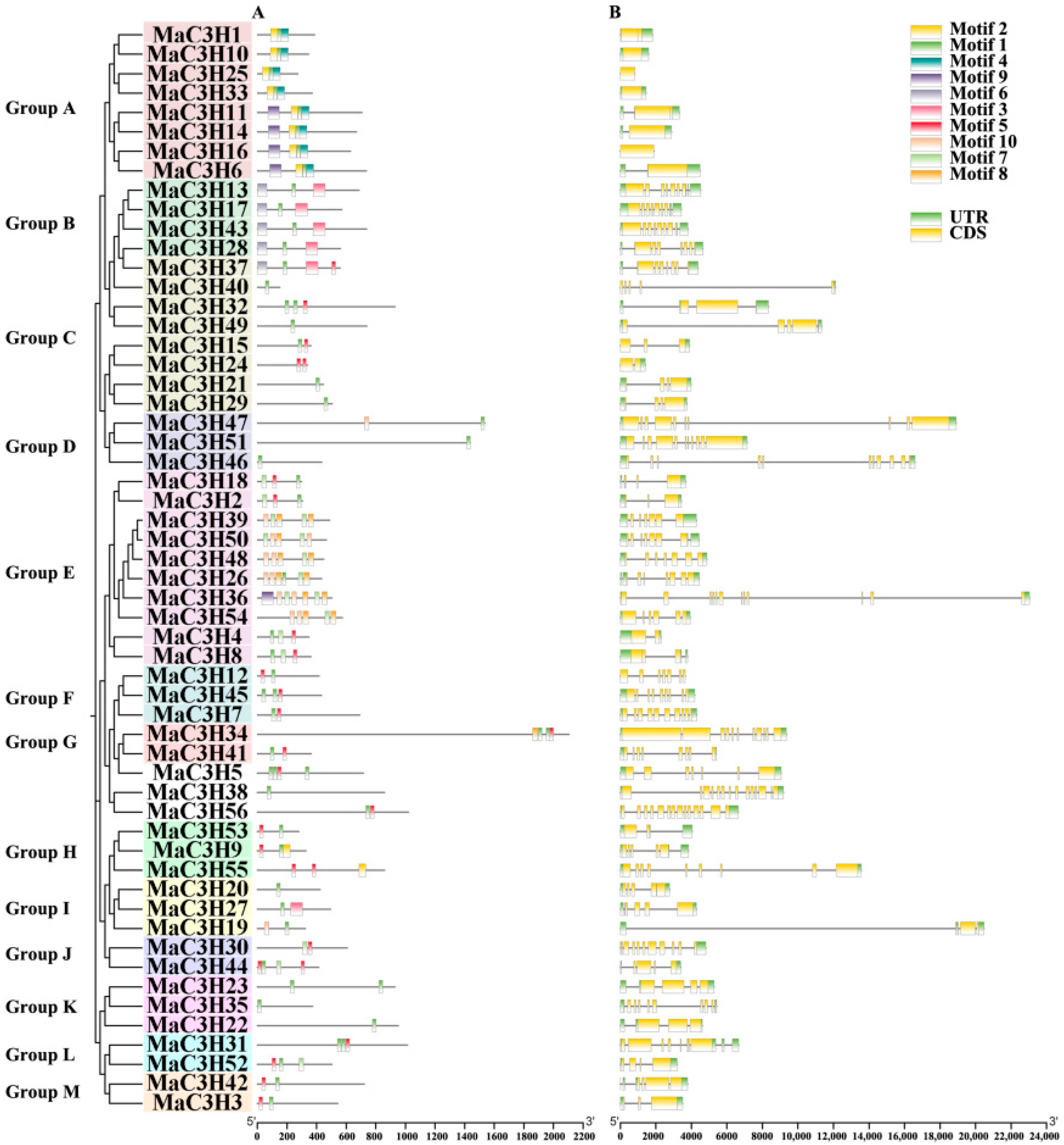 2.3. Motif and Gene Structure Analysis of MaC3Hs