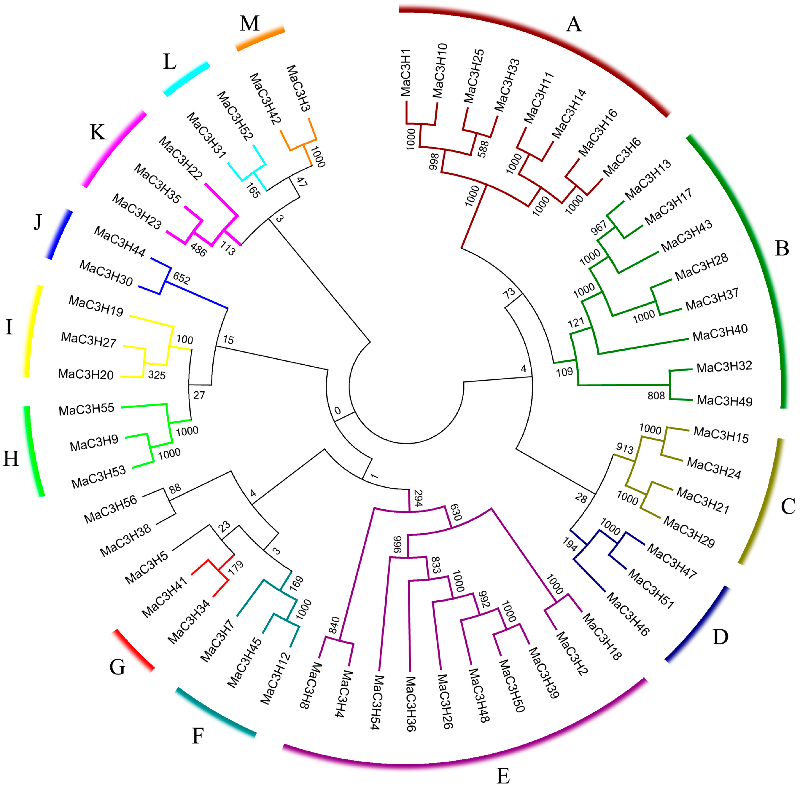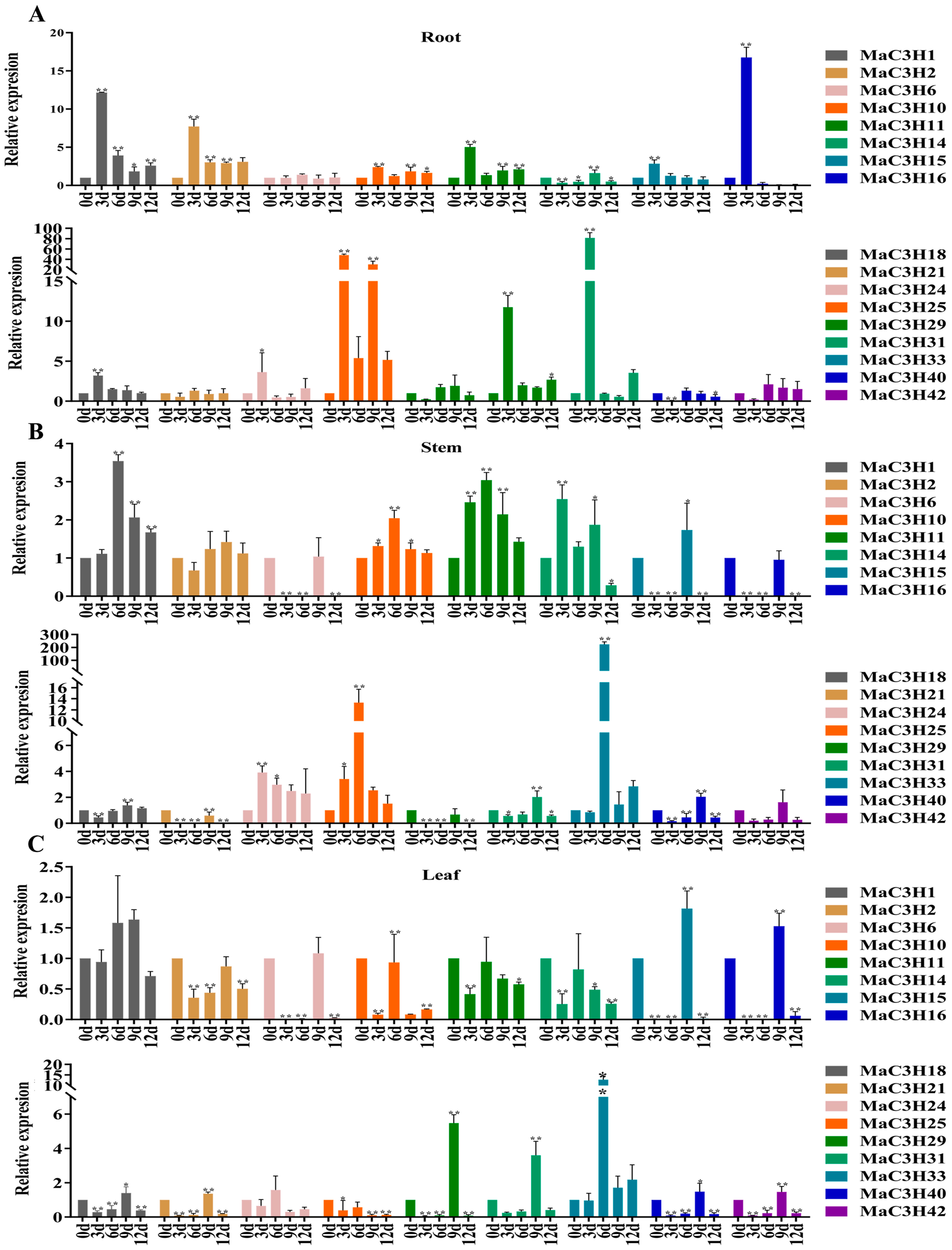 2.1. Identification of the MaC3H Genes