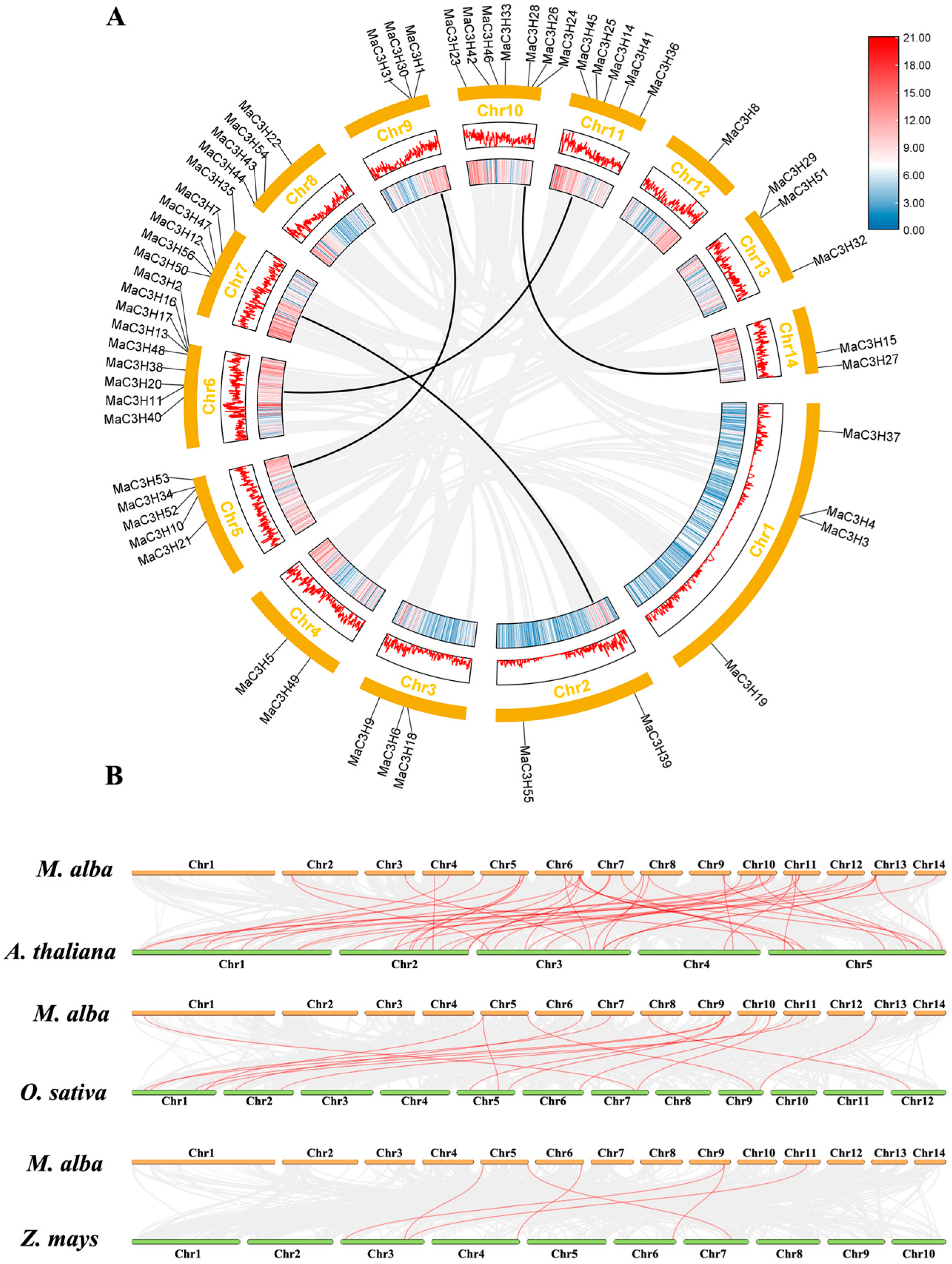 2.4. Synteny Analysis of MaC3Hs