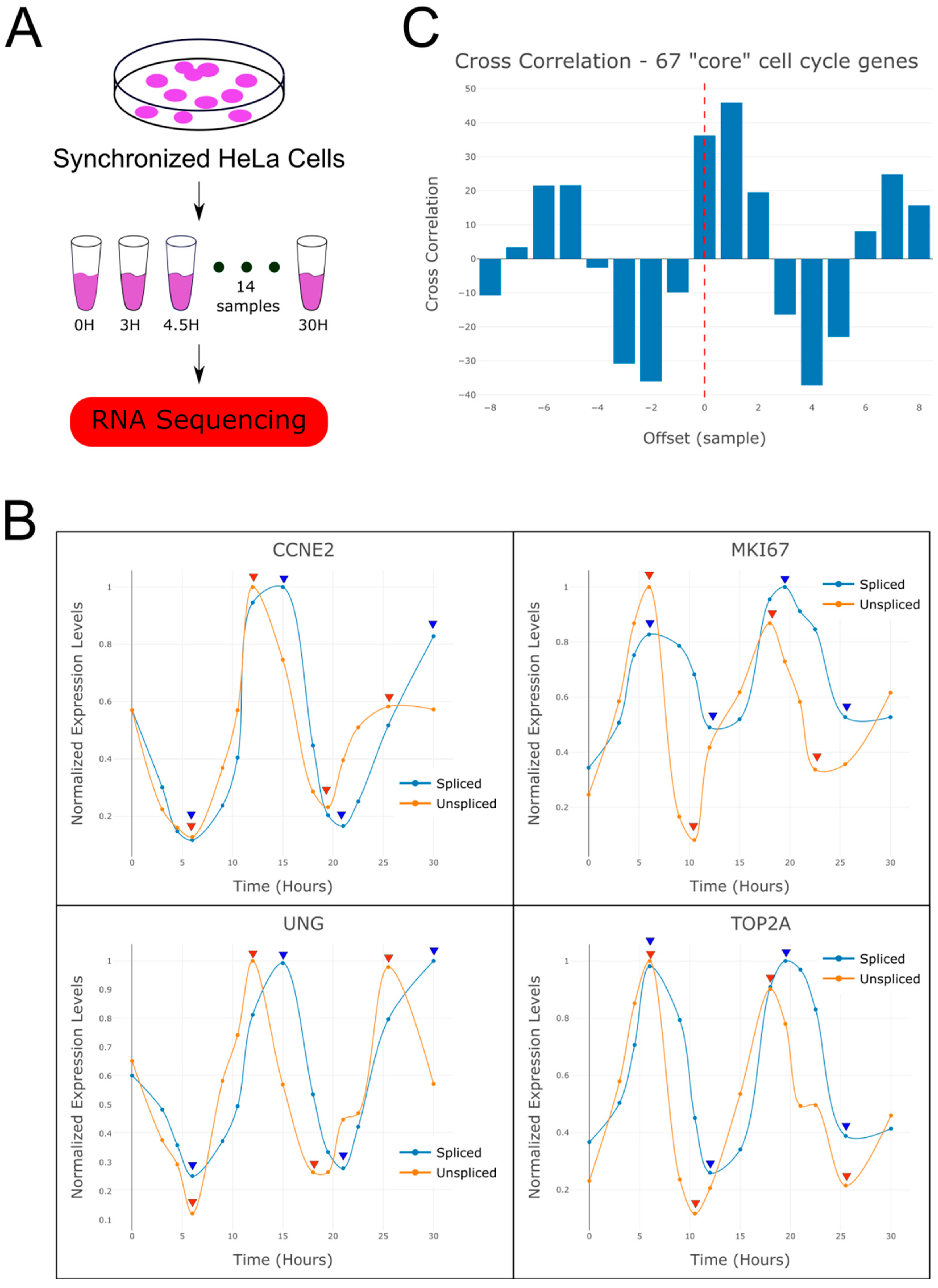 2.1. RNA Velocity Analysis of Periodically Expressed Genes Reveals a Time Lag Between Spliced and Un-Spliced mRNA