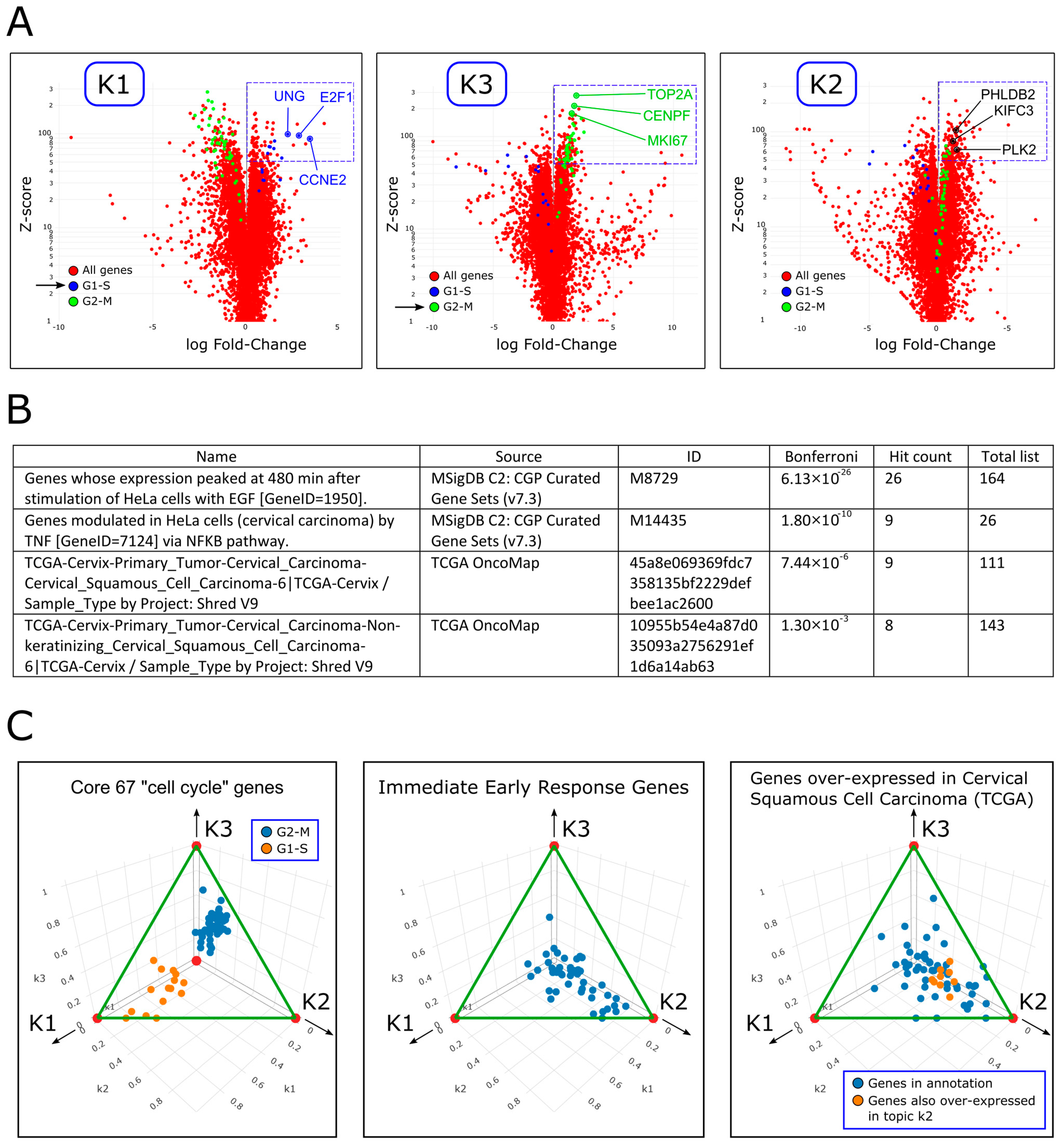 2.3. Topic Modeling Reveals Three Temporal Components, Two of Which Are Periodic, Corresponding to the G1-S and G2-M Phases of the Cell Cycle, and a Third, Transient Component, Related to Immediate Early Response, Regulation of Cell Proliferation, and Cervical Cancer