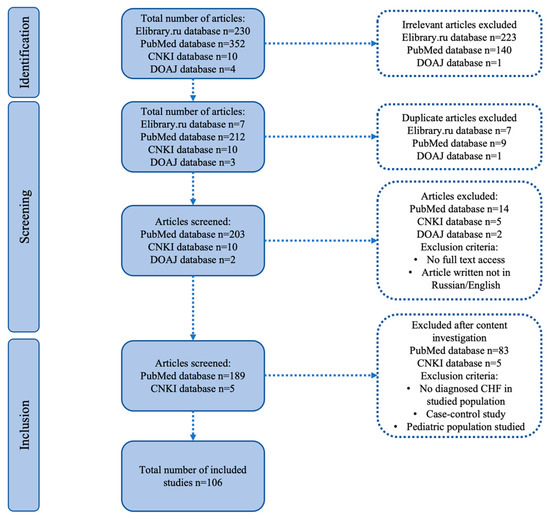 The initial number of publications was 596: 230 from Elibrary.ru, 352 from PubMed, 10 from CNKI, and 4 from DOAJ. After excluding invalid studies, duplicates, articles with no full-text access, and non-Russian/English publications, 189 articles from PubMed and 5 from CNKI remained. Further exclusion of studies without a confirmed CHF diagnosis in the study group, case–control studies, and those with pediatric populations resulted in 106 articles.