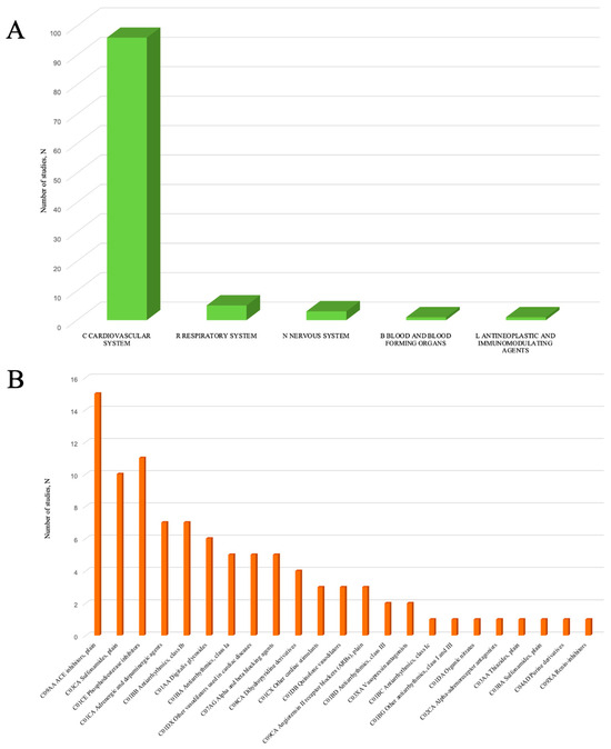 The leading group was represented by cardiovascular drugs (Group C), accounting for up to 96 studies (90.6%). Within this group, the subgroups with the largest number of studies were angiotensin-converting enzyme (ACE) inhibitors (C09AA) (n = 15; 15.6%), loop diuretics (C03CA) (n = 10; 10.4%), phosphodiesterase (PDE) inhibitors (C01CE) (n = 11; 11.5%), adrenergic agents (C01CA) (n = 7; 7.3%), and class Ib antiarrhythmics (C01BB) (n = 7; 7.3%). The structure of drug subgroups in Group C is presented in Figure 2B and Table S2.