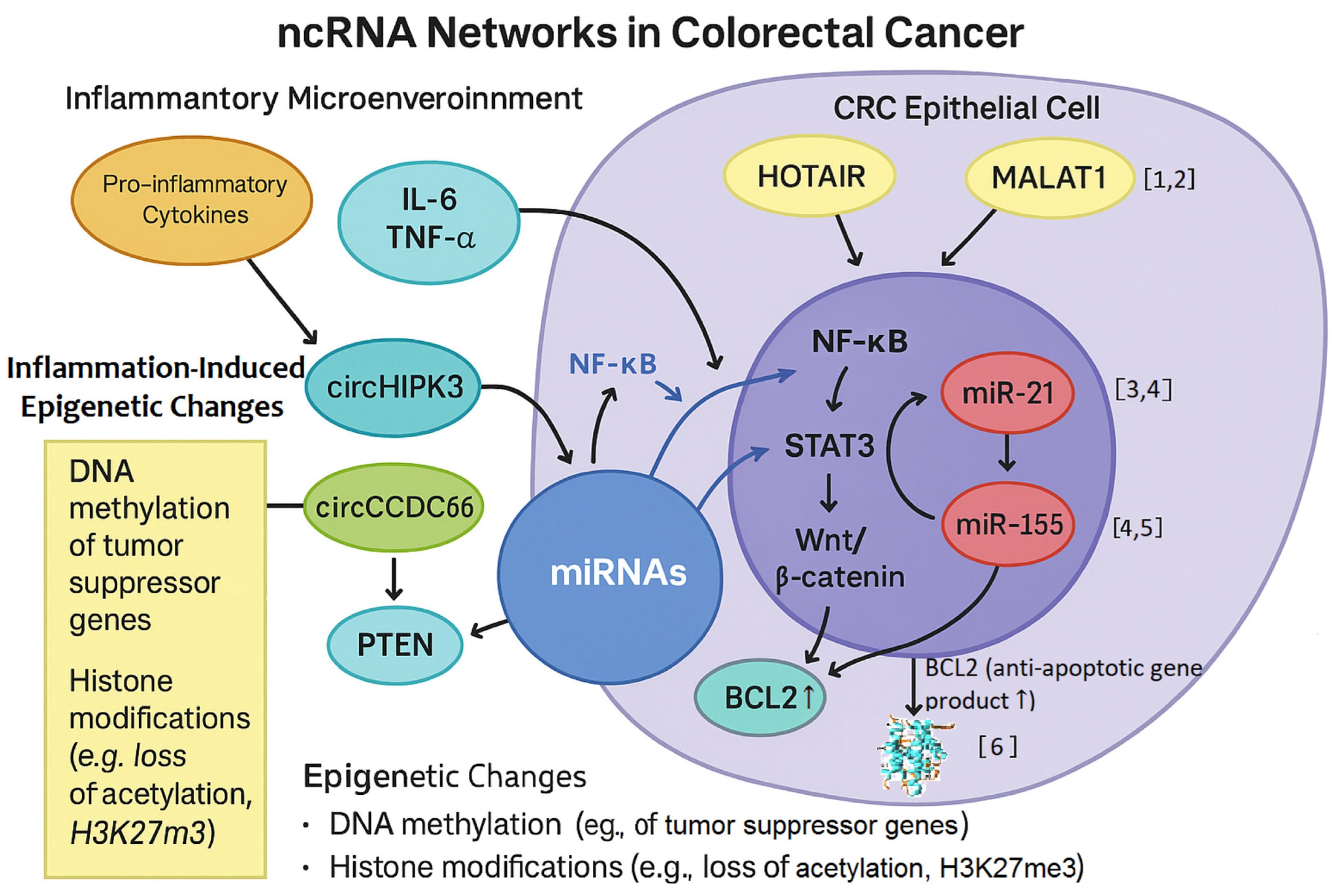 miRNA | miR-21 | Overexpressed in CRC; targets PTEN, PDCD4, suppressing apoptosis; regulated by NF-κB and IL-6 inflammatory stimuli. | 17968323; 20797623; 34771727 |
