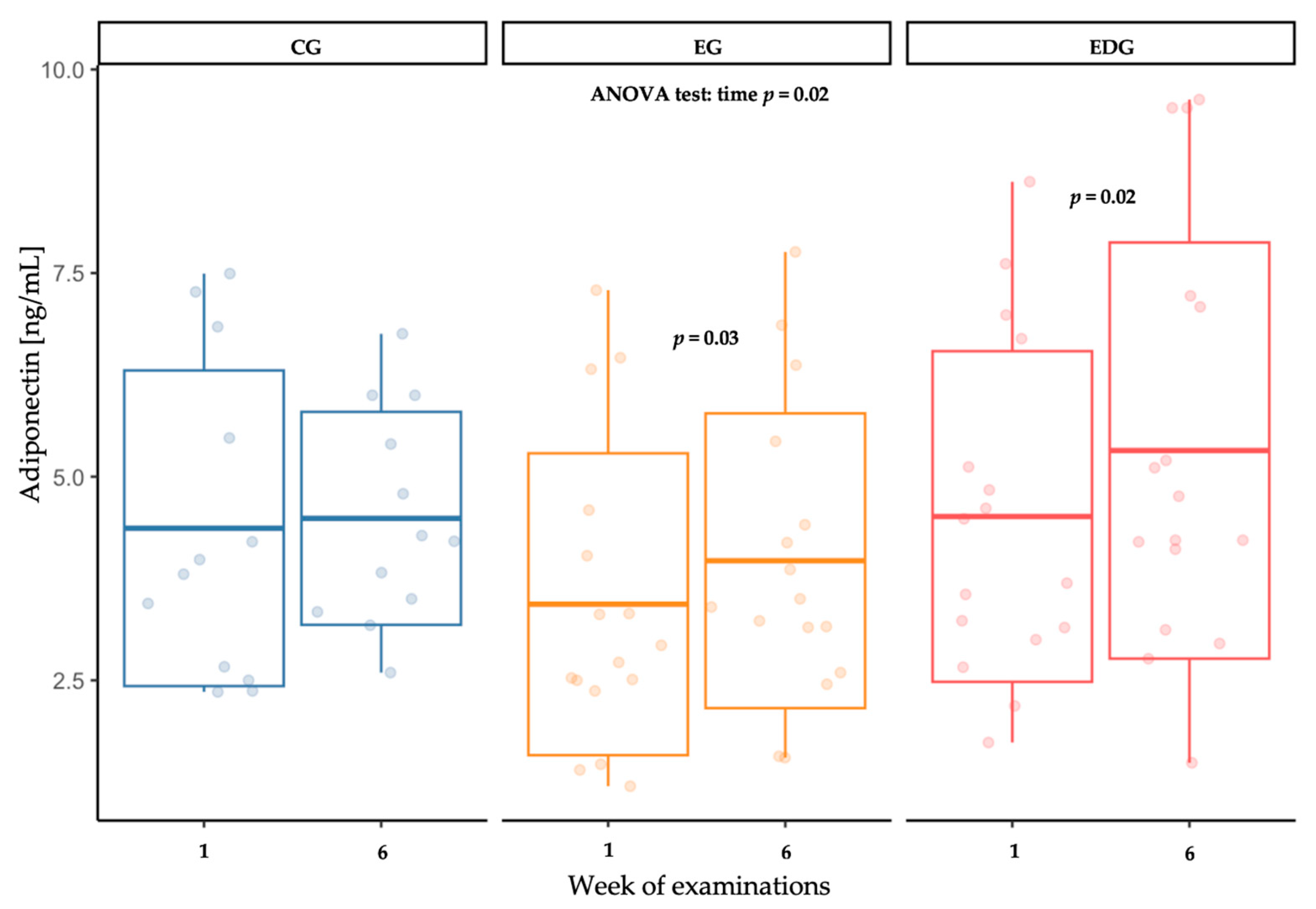 ADIPO [ng/mL] | baseline week 6 | 4.37 (1.94) 4.49 (1.31) | 3.43 (1.85) 3.97 b (1.85) | 4.51 (2.03) 5.32 b (2.56) | group time interaction | 1.71 6.26 0.99 | 0.19 0.02 0.38 | 0.07 0.02 0.01 |