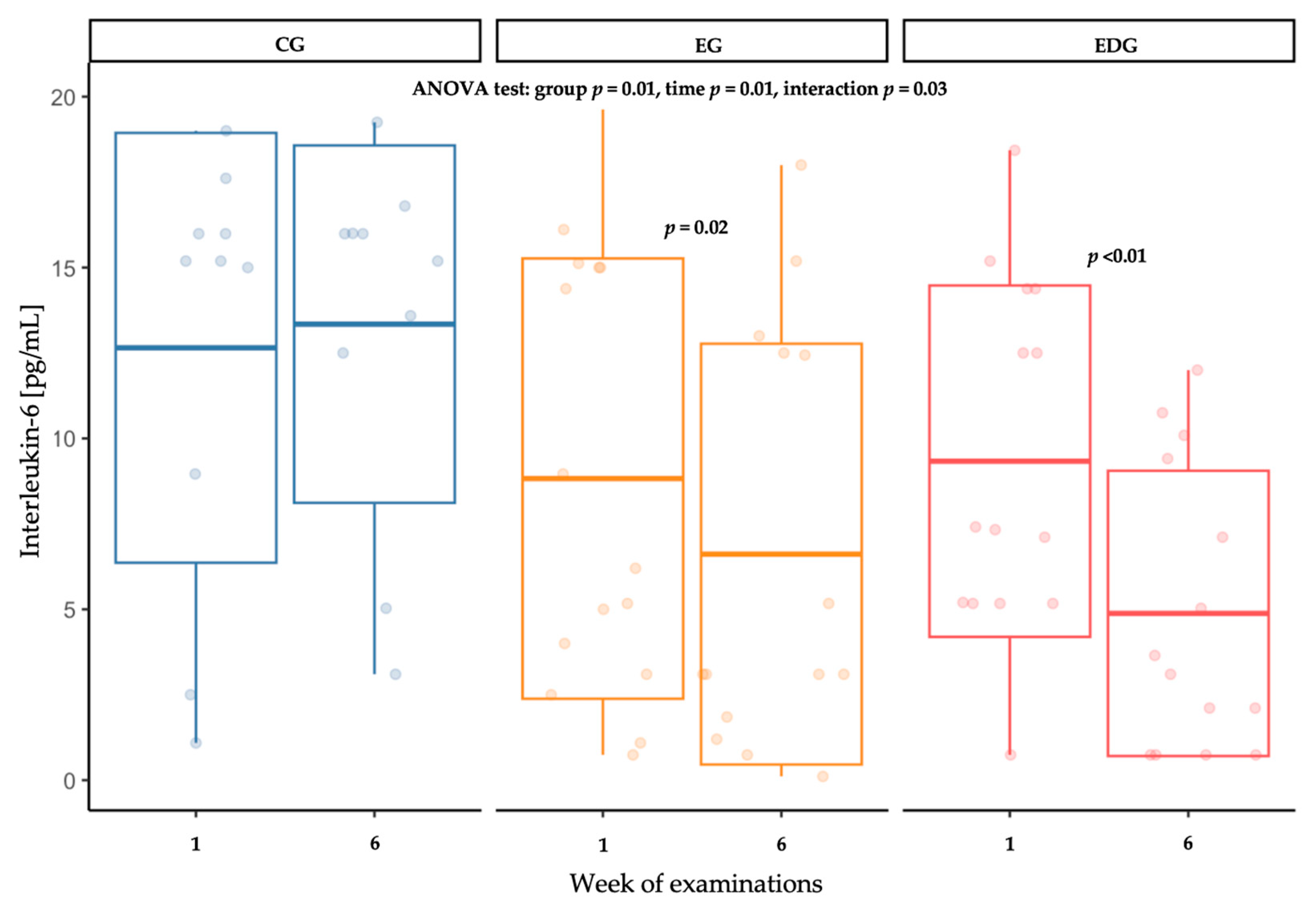 IL-6 [pg/mL] | baseline week 6 | 12.65 (6.29) 13.34 (5.23) | 8.83 (6.44) 6.17 a,b (6.17) | 8.72 (5.51) 4.56 a,b,c (4.21) | group time interaction | 4.86 8.67 3.86 | 0.01 0.01 0.03 | 0.18 0.03 0.03 |
