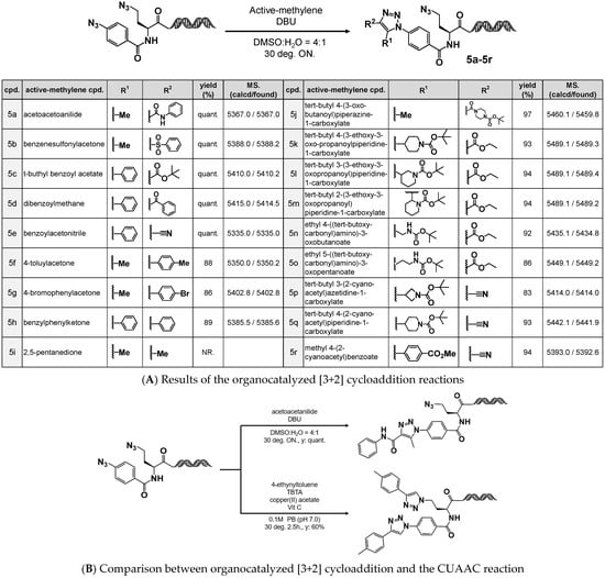 These data indicate that the CuAAC reactions proceeded successfully even when starting from the mixtures of four 1,4,5-trisubstituted 1,2,3-triazoles derived from the organocatalyzed [3+2] cycloadditions. However, the presence of some unreacted starting materials indicated that there is a need for further optimization of the CuAAC reaction conditions.