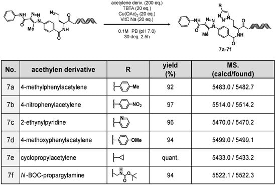 As shown in Figure 5, various alkynes, aromatic alkynes (7a, 7b, and 7d), a heteroaromatic alkyne (7c), and aliphatic alkynes (7e and 7f), were employed in the CuAAC reactions. In all cases, the corresponding 1,4-disubstituted 1,2,3-triazoles were obtained in high yields.