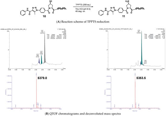 Reduction of the diazide platform molecule, (2S,4S)-4N3-BA-(S)-N3-Pro-HP. QTOF chromatograms and deconvoluted mass spectra of the starting material and the TPPTS-reduced product.