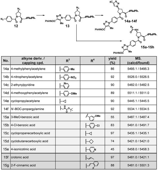 As observed previously with the 4N3-BA-(S)-N3-homoAla–HP platform, the stepwise reactions using aryl alkynes, a heteroaryl alkyne, and aliphatic alkynes all proceeded efficiently, affording the desired 1,4-disubstituted 1,2,3-triazoles in high yields (14a–14f). These results demonstrated that 4N3-BA-(2S,4S)-N3-Pro–HP can enable the construction of on-DNA compound libraries containing two distinct 1,2,3-triazole moieties with different substitution patterns by sequential application of the organocatalyzed [3+2] cycloaddition and CuAAC reactions to the two orthogonally reactive azides.