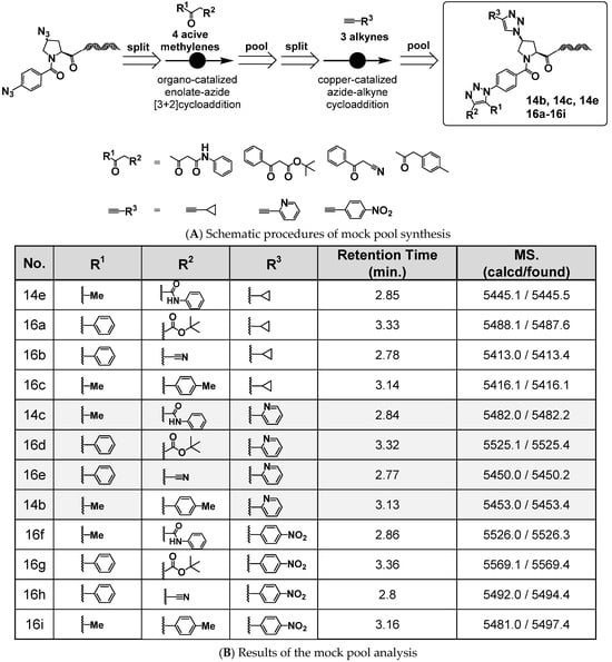 An aqueous solution of 4N3-BA-(2S,4S)-N3-Pro-HP was first divided into four portions, each portion being subjected to an organocatalyzed [3+2] cycloaddition with different active methylene compounds. The resulting products were combined, precipitated by ethanol, and lyophilized to obtain intermediate mixtures. These mixtures were redissolved in water, split into three portions, and then reacted with various alkyne derivatives via CuAAC. A portion of the reaction products was analyzed individually (Reaction Analysis 1), while the remainder was pooled, re-precipitated, re-lyophilized, re-dissolved, and analyzed collectively (Reaction Analysis 2) (Figure 9A).