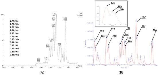 Results of mock DNA-encoded library synthesis via double click reactions of (2S,4S)-4N3-BA-(S)-N3-Pro-HP. (A) QTOF chromatogram of a mixture of 12 double click reaction products. (B) Deconvoluted mass spectrum of the mixture in (A).