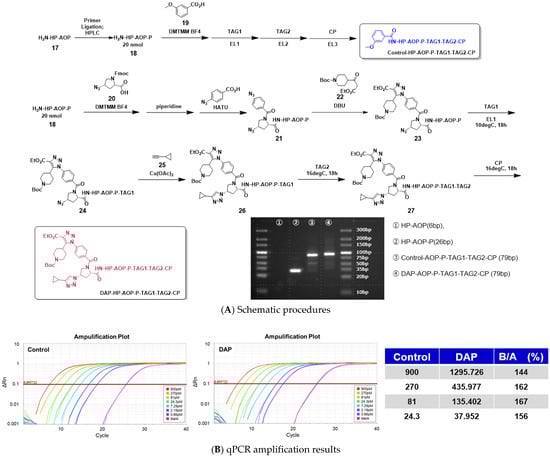 For this purpose, two distinct full-length DELs were designed and synthesized: Control-HP-AOP-P-TAG1-TAG2-CP and DAP-HP-AOP-P-TAG1-TAG2-CP. The AOP moiety corresponds to a 15-amino-4,7,10,13-tetrapentaoxadecanoyl group functioning as a spacer, whereas P and CP denote the double-stranded opening and closing primers, respectively. TAG1 and TAG2 represent double-stranded DNA tag elements.