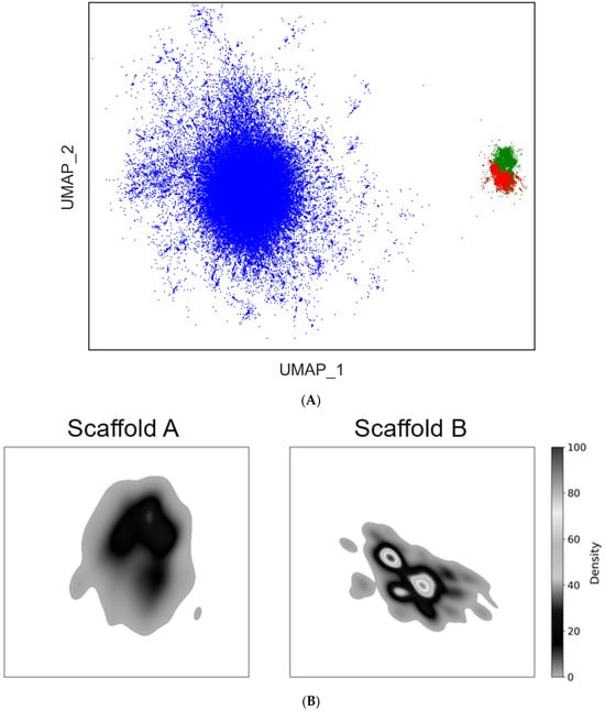 Chemical space analysis of a virtual DEL derived from (2S,4S)-4N3-BA-(S)-N3-Pro-HP. (A) Two-dimensional UMAP of compounds based on 1024-bit Morgan fingerprints (radius = 2). Compounds were categorized into three distinct scaffolds (A,B), and ChEMBL, shown in green, red, and blue, respectively). The UMAP representation highlights the distribution and clustering of chemical structures in reduced dimensional space, enabling a visual comparison of scaffold-specific chemical space coverage. The fingerprint descriptors were computed to capture structural features relevant to scaffold classification and were subsequently embedded using UMAP for visualization. (B) The text shows the kernel density estimation (KDE) of UMAP embeddings for Scaffold A and Scaffold B using a threshold of 0.01. The KDE areas were calculated to quantify the spatial distribution of each scaffold in the UMAP space. Using the KDE area of Scaffold B as 100%, Scaffold A exhibited a relative KDE area of 162%, indicating a broader spatial distribution in the embedded space. The density bars were normalized and scaled between 0 and 100.