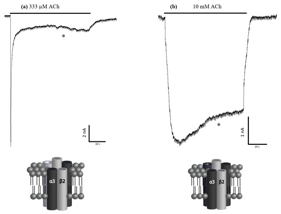 - Boorman, J.P.; Beato, M.; Groot-Kormelink, P.J.; Broadbent, S.D.; Sivilotti, L.G. The effects of β3 subunit incorporation on the pharmacology and single channel properties of oocyte-expressed human α3β4 neuronal nicotinic receptors. J. Biol. Chem. 2003, 278, 44033–44040. [Google Scholar] [CrossRef]