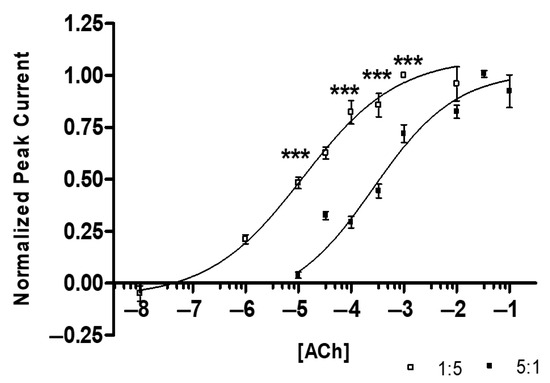 - Covernton, P.J.; Connolly, J.G. Multiple components in the agonist concentration-response relationships of neuronal nicotinic acetylcholine receptors. J. Neurosci. Methods 2000, 96, 63–70. [Google Scholar] [CrossRef] [PubMed]