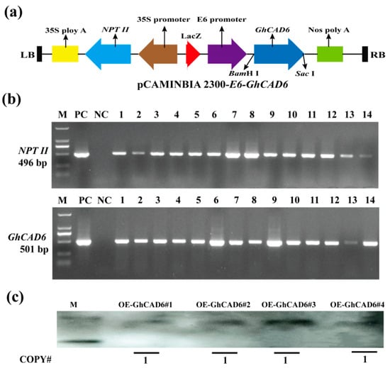 To investigate the role of GhCAD6 in lignin synthesis, we constructed the overexpression vector pCAMBIA 2300-E6-GhCAD6, utilizing the E6 fiber-specific promoter (Figure 1a). This vector was transformed into the upland cotton variety Zao 36 via, resulting in the generation of GhCAD6 overexpression plants. Fourteen positive plants were identified using two sets of specific primers: NPT II-F/R and E6-F/GhCAD6-R (Supplementary Materials Table S1). Additionally, single-copy insertion was confirmed through Southern blot analysis. The results indicated that 14 positive clones were obtained (Figure 1b), and transgenic progenies from four single-copy lines were detected for further study (Figure 1c).