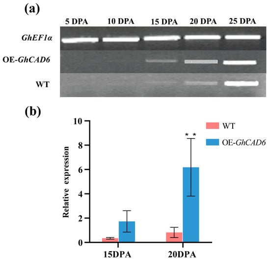Expression analysis of GhCAD6 gene during cotton fiber development. (a) RT-PCR analysis of GhCAD6 gene in different developmental stages of cotton fiber. (b) The qRT-PCR analysis of GhCAD6 gene in cotton fiber elongation. ** p < 0.01.