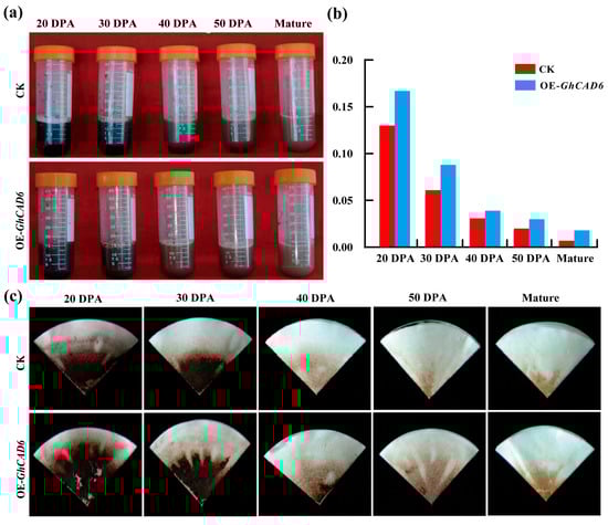 Given that GhCAD6 is predominantly expressed during the secondary wall synthesis stage in fiber cells (Figure 2), we employed the Klason method to detect lignin and lignin-like phenolic compounds in mature cotton fibers, aiming to determine whether GhCAD6 regulates lignin biosynthesis. We measured the lignin content in both transgenic progeny and control plants of equivalent quality at various developmental stages of cotton fiber (20, 30, 40, 50 DPA, and mature). By observing the changes of cotton fiber samples at different development stages after the addition of 72% sulfuric acid for 1 h, it was found that the color of overexpression plants was darker (Figure 3a). The comparative map of lignin residue in cotton fiber on filter paper was observed. The results showed that the lignin content decreased with the increase in development days. Compared with the lignin content in transgenic progeny and control, it was found that the lignin content in transgenic progeny was higher than that in controls in the same development period (Figure 3b,c). These findings demonstrate that cotton fiber contains lignin, and the GhCAD6 gene plays a positive regulatory role in lignin synthesis.