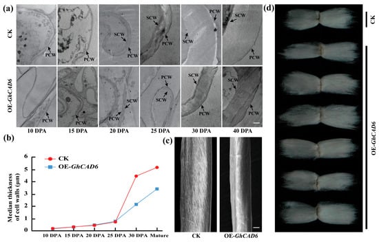 Observation of cotton fiber between GhCAD6 overexpression plant and control. (a) Electron microscopic observation of cell wall thickness at different stages of cotton fiber development between GhCAD6 overexpression plants and control, note. scw: Primary cell wall, pcw: Secondary cell wall, scale: 1 μm, filmed under the condition of ×10,000. (b) Comparison of cell wall thickness at different stages of cotton fiber development between GhCAD6 overexpression plants and control. (c) Electron microscopic observation on the surface of mature cotton fiber of GhCAD6 overexpression plant and control, scale: 1 μm, filmed under the condition of ×30,000. (d) Fiber images of overexpression plants and control plants.