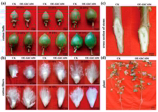 During the growth of transgenic and control plants, observations were made of cotton bolls, seed cotton, plant height, and stem sections at different developmental stages (Figure 5). We found no change in plant height of OE-GhCAD6 plants (Figure 5d). However, the transgenic cotton bolls were slightly larger than those of the control plants (CK) at different developmental stages (10, 15, 20, 25, 30, 40 DPA). At different developmental stages, the boll shape of the OE-GhCAD6 line changed from round to oval (Figure 5a). After in vitro culture, the fiber length of OE-GhCAD6 was significantly longer than that of the control (Figure 5b). At the same time, we also found that OE-GhCAD6 plants were less infected with disease through the rod-cutting method, and it was speculated that the overexpression of GhCAD6 may enhance cotton disease resistance (Figure 5c).
