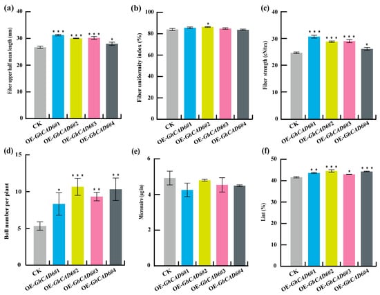 Comparison of fiber quality parameters between overexpression plants and control plants. (a) the fiber upper half mean length; (b) the fiber uniformity index; (c) the fiber strength; (d) the boll number per plant; (e) the micronaire values; (f) the lint percentage. * p < 0.05, ** p < 0.01, *** p < 0.001.