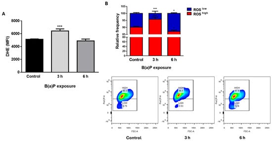 B(a)P treatment induced an increase in cellular ROS levels. MCF10A cells were treated with 2 μM B(a)P and ROS levels were evaluated by dihydroethidium (DHE) staining. B(a)P treatment induced an increase in ROS levels after a 3 h exposure, represented both as the mean fluorescence intensity (MFI, A) and as ROS-low and ROS-high populations (B). Graphs show mean fluorescence intensity or relative frequencies ± SD of 4–5 independent experiments. One-way (A) or two-way ANOVA (B), with Dunnett’s post hoc tests. * difference with respect to the control, * p < 0.05; *** p < 0.001.