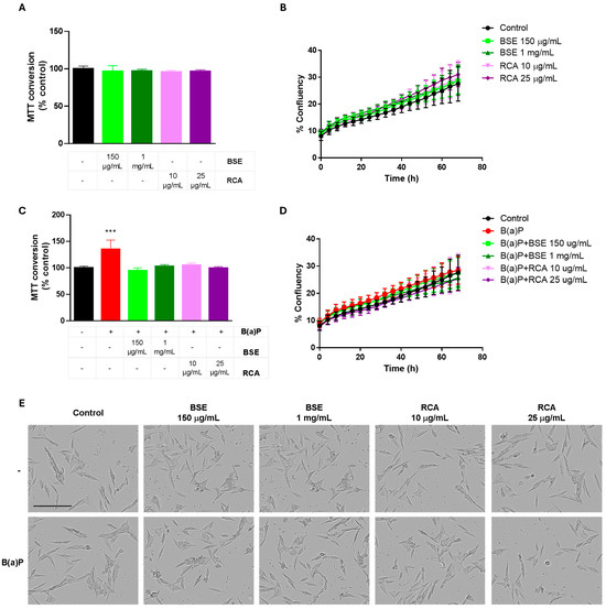 Previous results from our group using the same extracts have shown that doses lower than 2.5 mg/mL of BSE or 50 μg/mL of the RCA extracts do not have an important effect on cellular proliferation of the MCF10A cell line [16]. Accordingly, 150 μg/mL or 1 mg/mL BSE and 10 μg/mL or 25 μg/mL RCA extracts did not induce differences in MTT (Thiazolyl Blue Tetrazolium Bromide) conversion after a 24 h treatment (Figure 2A) or after a 72 h treatment, as measured by cellular confluency (Figure 2B,E). A 24 h 2 μM B(a)P treatment increased MTT conversion in MCF10A cells, suggesting an induction of cellular proliferation. Importantly, all the tested doses of both extracts were able to prevent this increase in MTT conversion (Figure 2C). When cellular proliferation was measured as cellular confluency (Figure 2D,E), despite an apparent increase in confluency observed with the B(a)P treatment, this was not statistically significant at 72 h, indicating that the B(a)P treatment did not increase cellular confluency up to 72 h of treatment and that the observed increase in MTT conversion might be due to changes in cellular metabolism induced by B(a)P and not by increased proliferation at this time point. These results indicate an early metabolic change induced by B(a)P treatment that can be prevented by BSE or RCA extracts. Importantly, no important changes in cell morphology were observed after a 48 h B(a)P treatment with or without the extracts (Figure 2E).