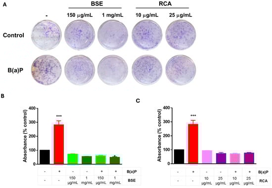 To further evaluate the role of B(a)P on cellular proliferation, we performed a long-term clonogenic assay, where cells were plated and treated with B(a)P± BSE or RCA for 72 h. The medium was replaced with fresh media without treatment and allowed to grow for 8 days. The results are shown on Figure 3. When measured after 8 days of exposure, B(a)P induced proliferation in the MCF10A cells, and this increase in proliferation was prevented by BSE (Figure 3A,B) or RCA (Figure 3A,C) treatment.