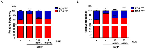 BSE and RCA extracts prevented B(a)P-induced ROS production. MCF10A cells were treated with B(a)P along with BSE (A) or RCA (B) at the indicated concentrations for 3 h, and ROS were evaluated with DHE staining and flow cytometry. The graphs show mean relative frequencies ± SD of 3–5 independent experiments. Two-way ANOVA with Dunnett’s post hoc test; * vs. control, * p < 0.05; **** p < 0.0001.