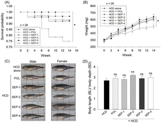 The repeated ANOVA outcomes utilizing the multivariate tests (Pillai’s Trace, Wilks Lambda, Hotelling’s Trace, and Roy’s largest root) revealed a significant effect of time (0–14 weeks, F = 148, p = 0.00) on the elevation of body weight among all the groups (Figure 1B). Interestingly, all the groups except SEP-2 exhibited nearly identical magnitudes of body weight changes at specific time points that corresponded to the body weight changes observed in the HCD (control) group at the respective time. In contrast, the SEP-2 supplemented group displayed the least body weight gain compared to other groups. Compared to the initial day (week 0) a notable ~2-fold enhancement of the body weight was observed after 14 weeks in the HCD, POL, SEP-1, SEP-3, and SEP-4 supplemented groups. In contrast, after 14 weeks, only a 1.7-fold body weight enhancement with respect to the initial day (week 0) was noticed in the SEP-2 supplemented group (Figure 1B). Notably, at 14 weeks, the SEP-2 supplemented group attained a significantly 18% (p < 0.05) lower body weight (506.8 ± 29.8 mg) than the body weight of the HCD consumed group (614.8 ± 27.5 mg), whereas no significant changes in the body weight compared to the HCD group were noticed in rest of the groups (i.e., POL, SEP-1, SEP-3, and SEP-4). Consistently, morphometric analysis revealed a significant change in the body length (BL)/body depth (BD) ratio in the zebrafish from the SEP-2 supplemented groups compared to the HCD group (Figure 1D). Unlike this, non-significant changes in the BL/BD ratio were noticed in POL, SEP-1, SEP-3, and SEP-4 groups with respect to the HCD group.